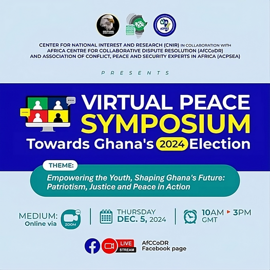 Centre for National Interest and Research (CNIR-GH) in Collaboration with Africa Centre for Collaborative Dispute Resolution (AfCCoDR) and Association of Conflict, Peace and Security Experts in Africa (ACPSEA) Presents: Virtual Peace Symposium towards Ghana’s 2024 Election